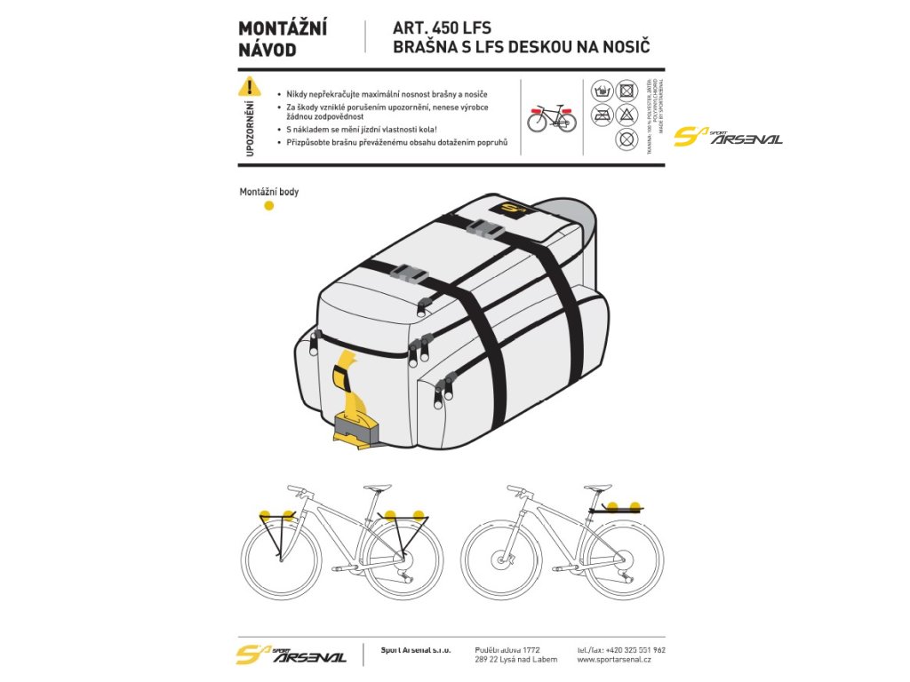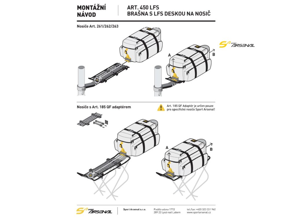 Na klasické zadní nosiče Sport Arsenal nebo přední nosič art.203 Sport Arsenal lze tuto brašnu použít pouze po přidání adaptéru Art.185 QF . Originální QuickFix systém přináší jednoduché, rychlé a spolehlivé uchycení brašny k nosiči.