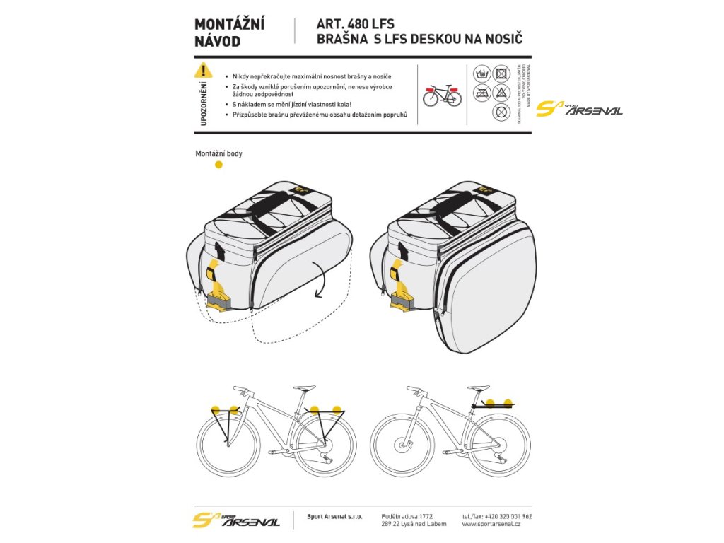 Na klasické zadní nosiče Sport Arsenal nebo přední nosič art.203 Sport Arsenal lze tuto brašnu použít pouze po přidání adaptéru Art.185 QF . Originální QuickFix systém přináší jednoduché, rychlé a spolehlivé uchycení brašny k nosiči.