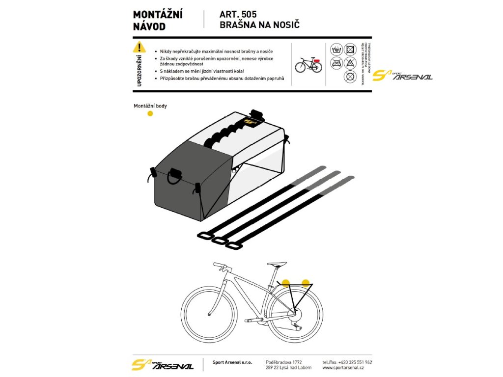 Praktická brašna středního objemu s upínáním k nosiči suchými zipy. Ideální brašna pro kombinaci s nosičem umístěným na sedlové trubce-např. art. 220, 209. Obecně je brašna kompatibilní se všemi nosiči Sport Arsenal. Boční gumicuky slouží k variabilní změně objemu brašny /zatažením-povolením/, ale také fixují váš náklad. Praktický popruh pro přenášení na rameni je součástí brašny. 3M bezpečnostní reflexní pásek na brašně zaručí vaši lepší viditelnost na cestách.