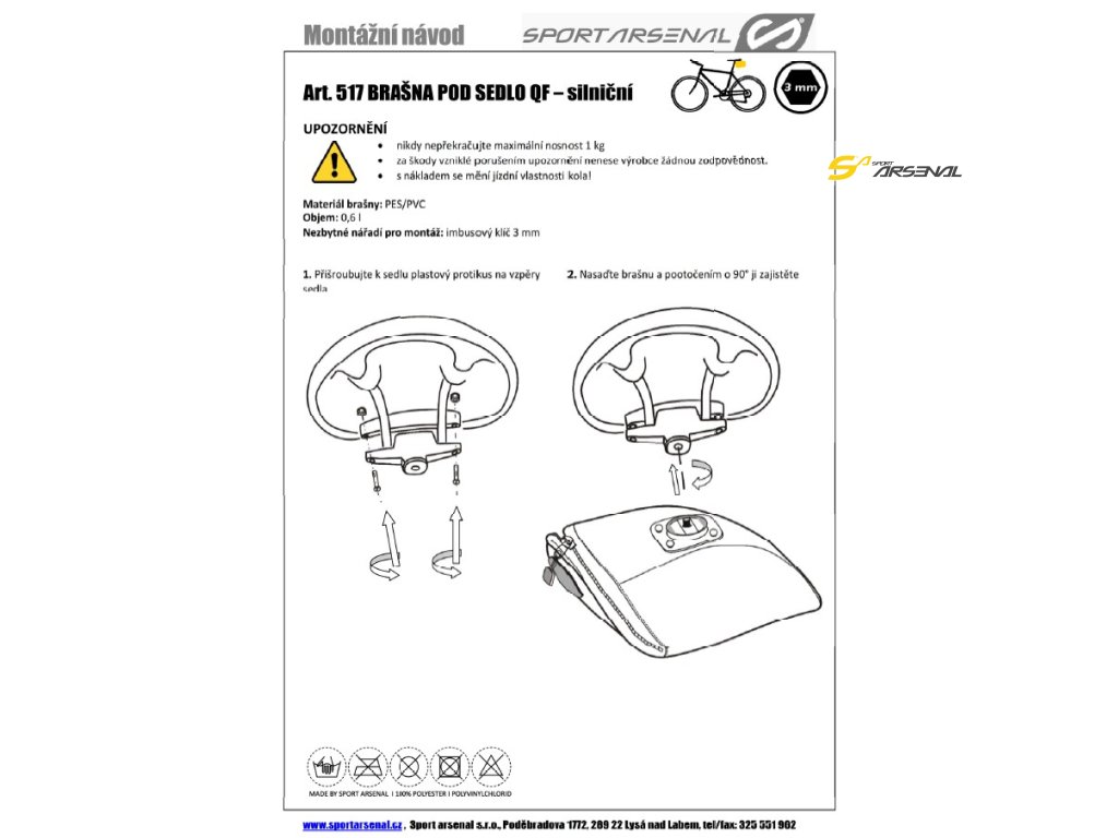 Brašna pod sedlo s minimalistickým designem je nenápadná a pojme to nejdůležitější co je na cestách potřeba. Klíče, peníze, lepící sadu na duši, anebo nářadí na opravu kola. Brašna se připevňuje pomocí držáku Quick Fix, tento systém zaručí jednoduché odpojení brašny z držáku. Úzký profil brašny v žádném případě neomezí pohyb vašich nohou při šlapání. Na silničku, anebo jiný typ kola, je tato brašna ideálním doplňkem.