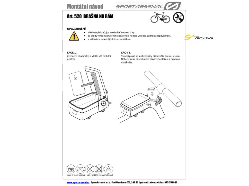 Brašna na přední část rámu a na představec řídítek. Praktická objemná brašna na veškeré nezbytnosti, které je třeba mít stále na očích (mobilní telefon, kompaktní fotoaparát, peněženka, klíče, sušenka).