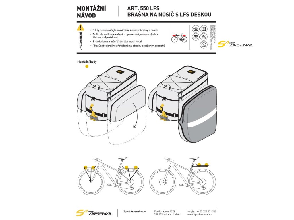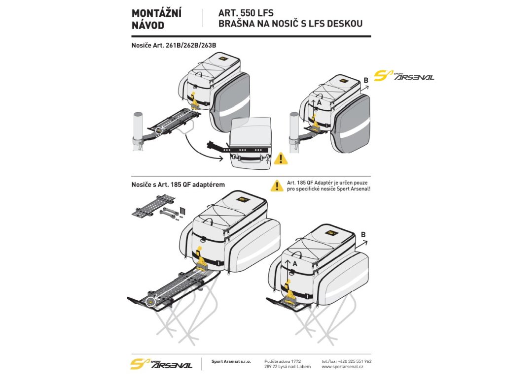 Na klasické zadní nosiče Sport Arsenal nebo přední nosič art.203 Sport Arsenal lze tuto brašnu použít pouze po přidání adaptéru Art.185 QF . Originální QuickFix systém přináší jednoduché, rychlé a spolehlivé uchycení brašny k nosiči.