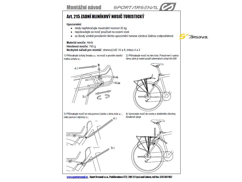 Nosič z řady výrobků pro speciální a náročnou cykloturistiku je určen pro několikadenní až několikatýdenní cesty se střední zátěží. Díky speciální ALU slitině má nižší hmotnost, při zachování vysoké nosnosti. Materiál je nejen pevný a lehký, ale i houževnatý s výbornou odolností proti korozi. Na nosič lze využít celou řadu brašen Sport Arsenal, např. Art. 450, 460 a 465, nebo boční a vrchní expediční brašnu Art. 312 a 313.