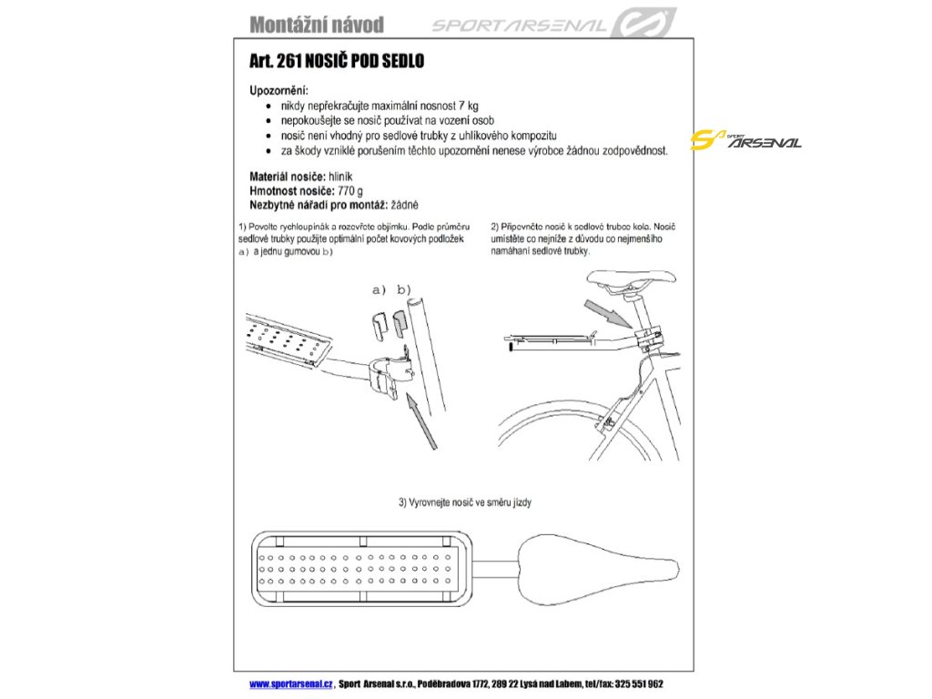 - nosič je vhodný zejména pro brašnu Art.505 a 450, dále pak Art.550 a 560 (pouze bez rozevření bočních kapes), nebo pro přepravu spacáku, stanu a jiného nákladu připevněného pomocí elastického popruhu